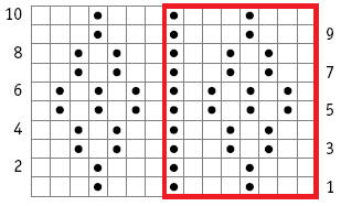 R3 | K2, p1, k1, *[p1, k2] twice, p1, k1* | rep from *, end p1, k2 |