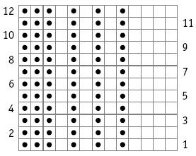 R2 | *K3, [p1, k1] 3 times, p4* | rep from * to end |