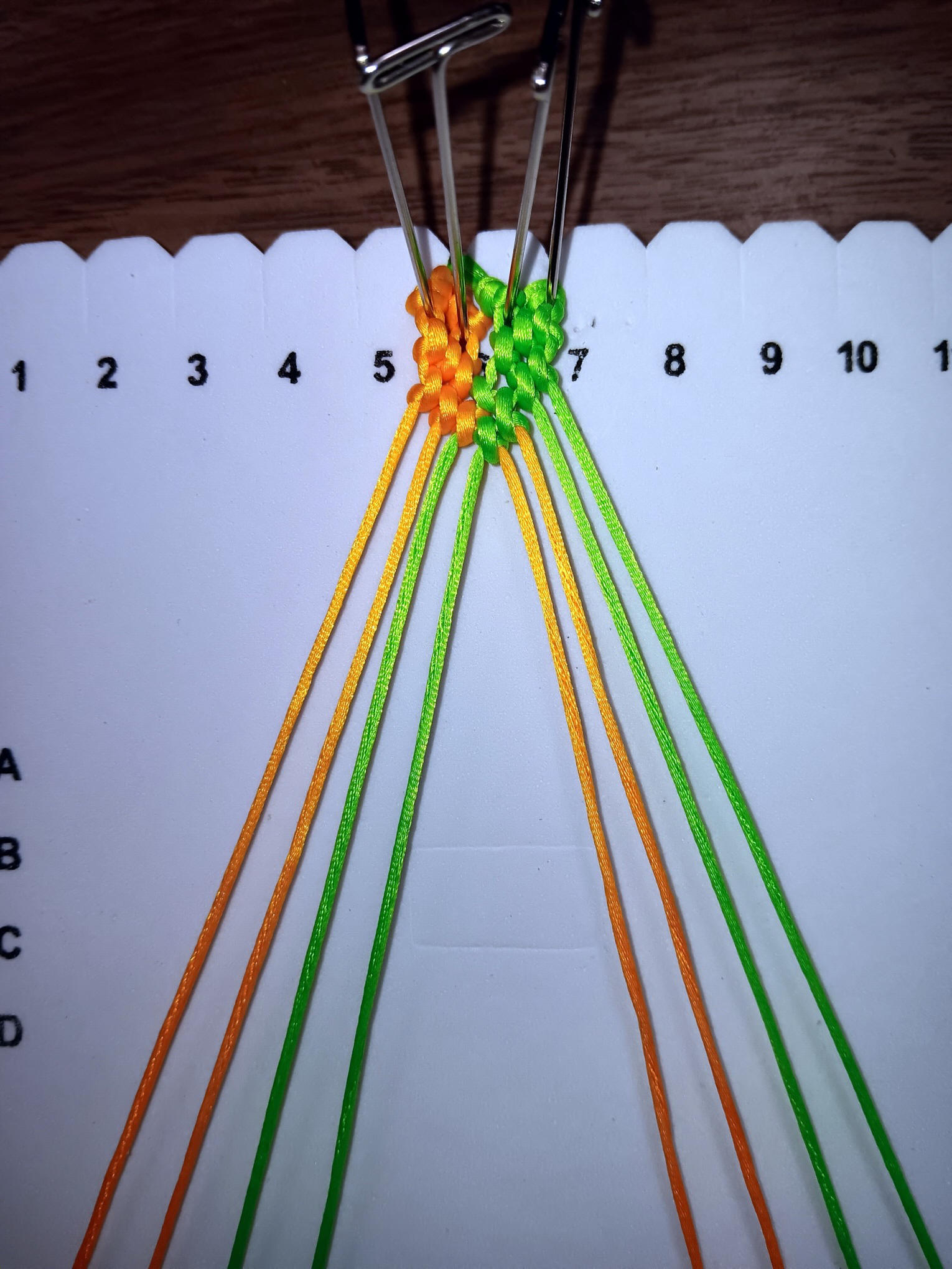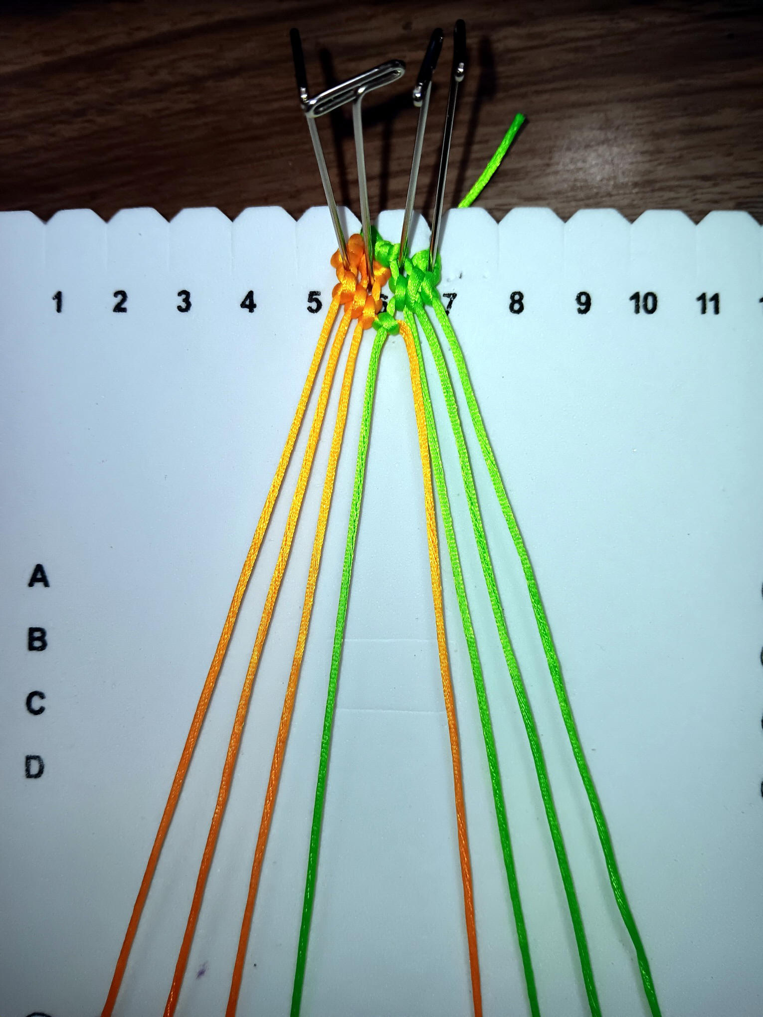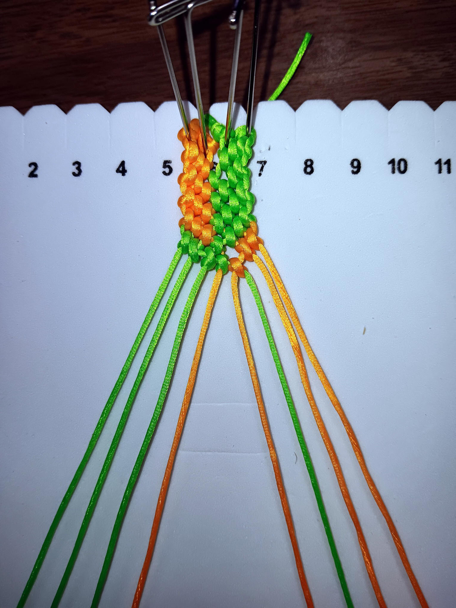 2° Nouez le fils extérieur Vert droit sur les 4 prochains fils (Toujours Nouer le fil vert avec 4 fils)