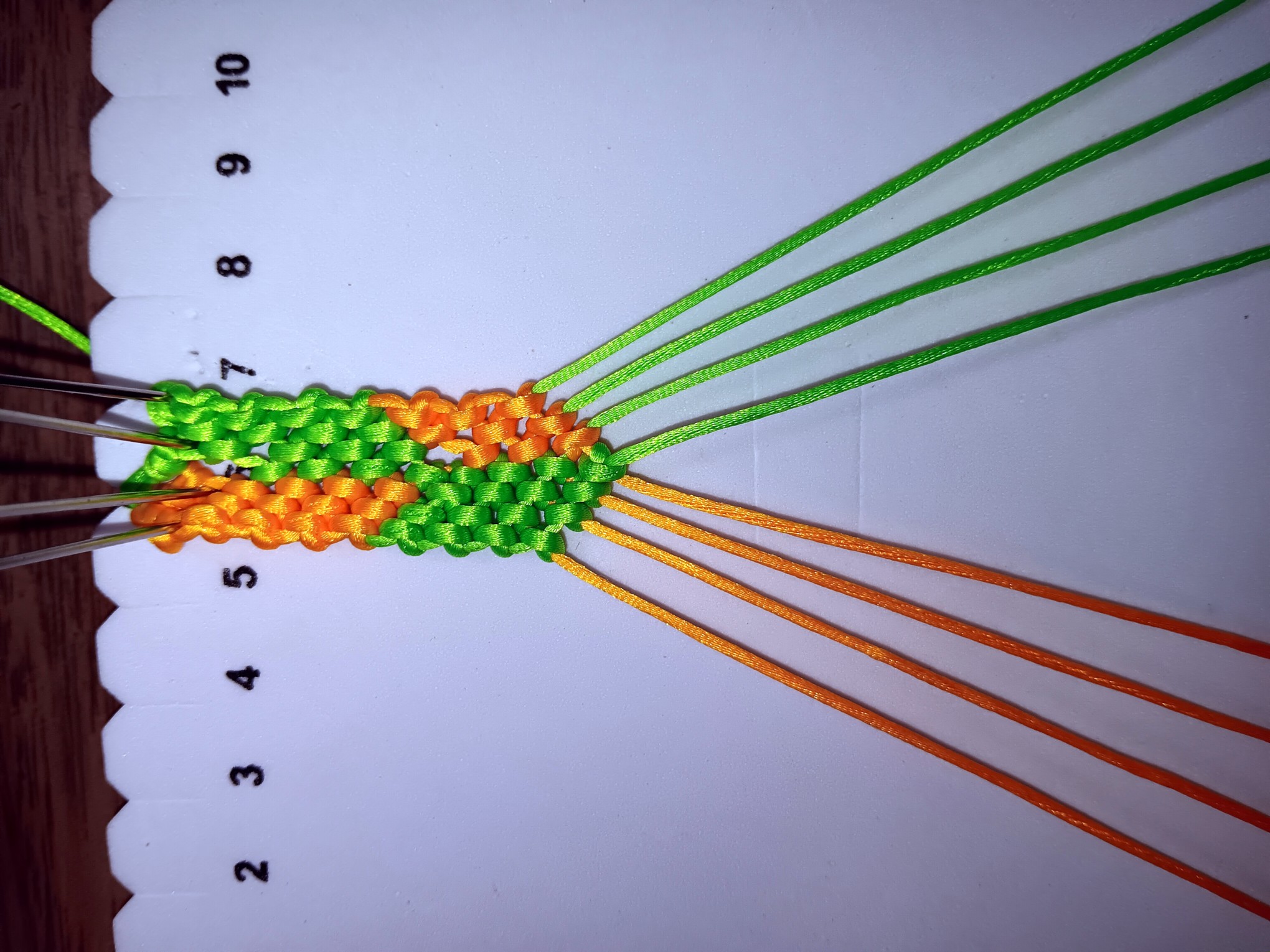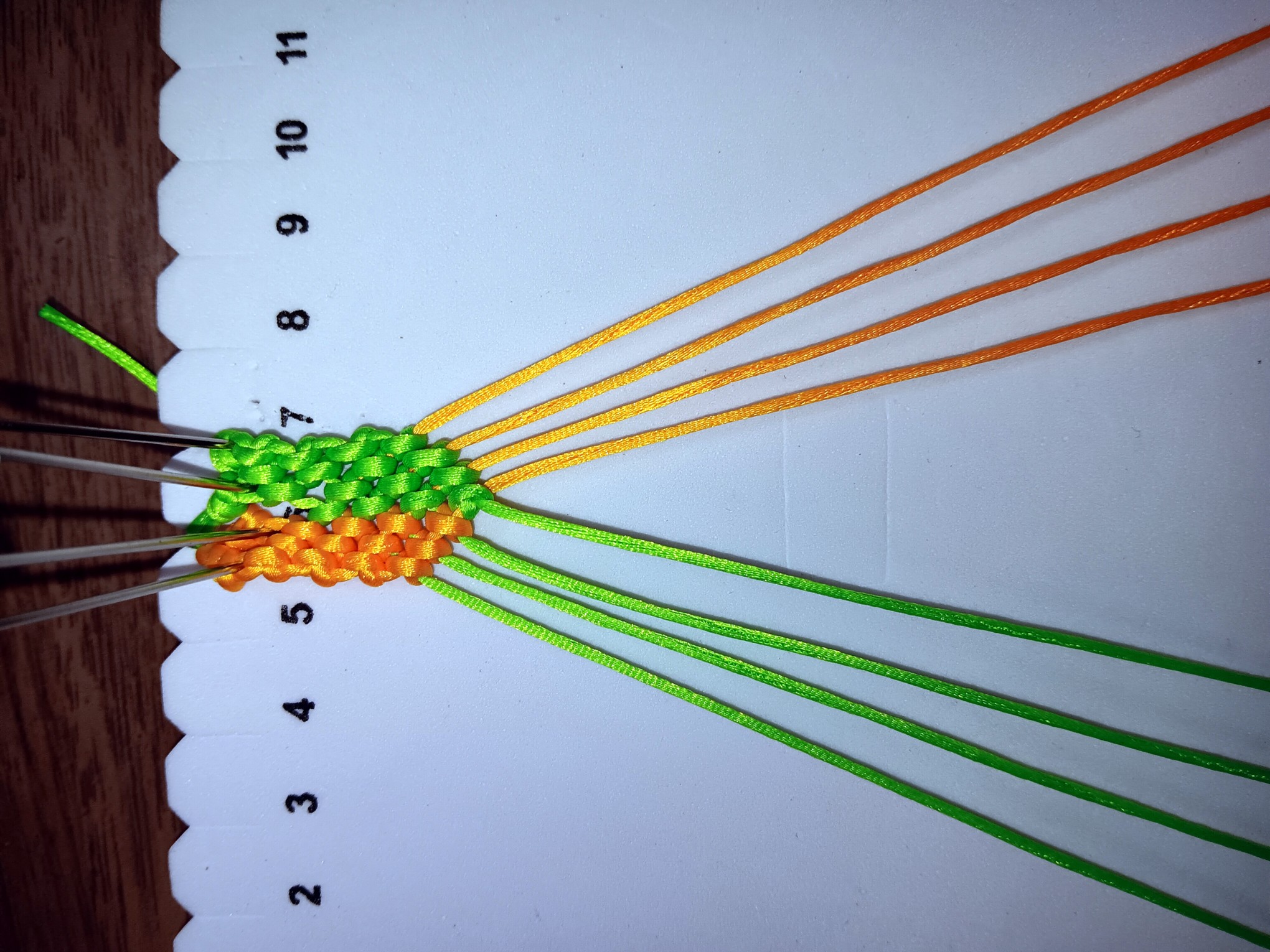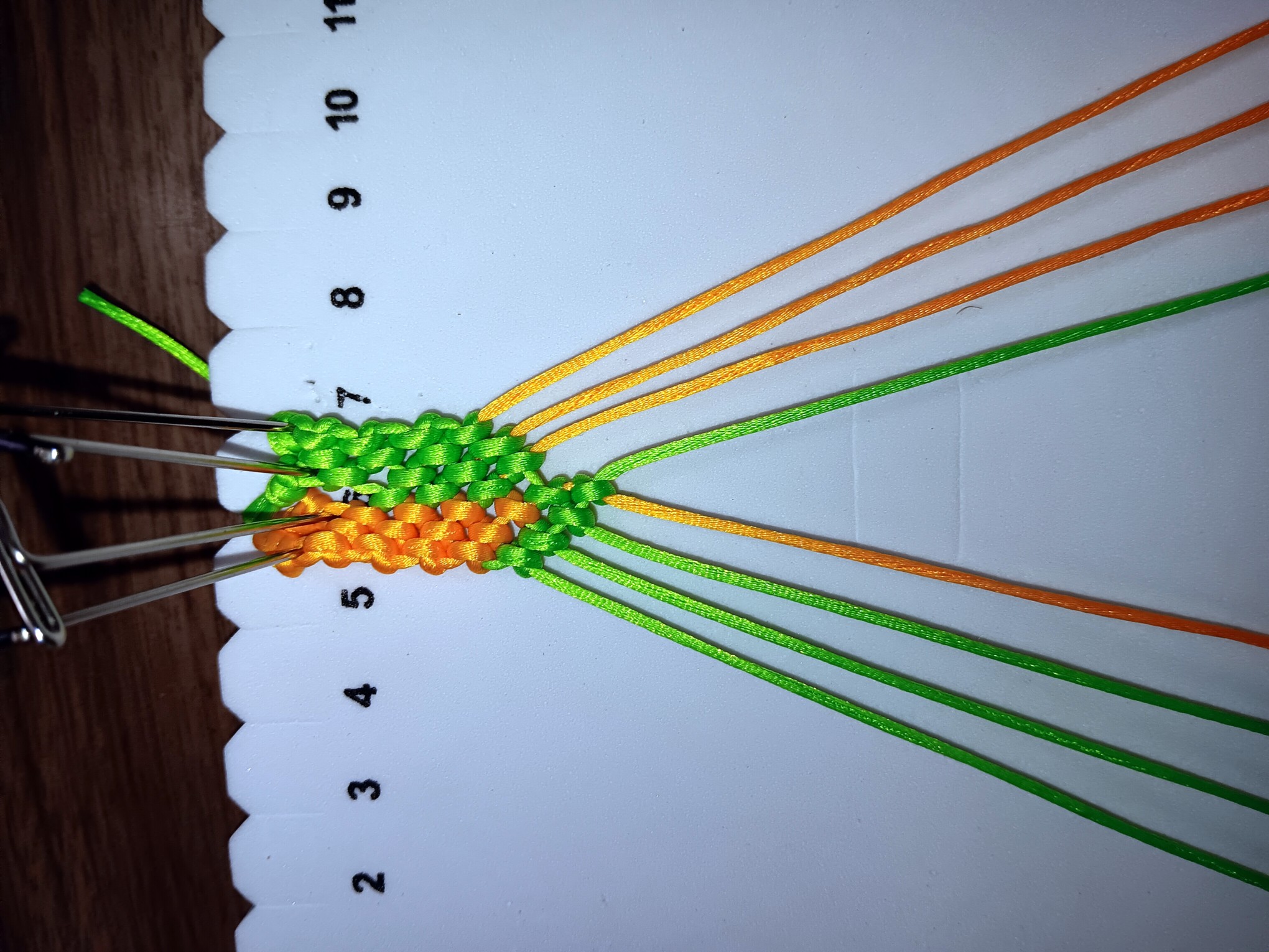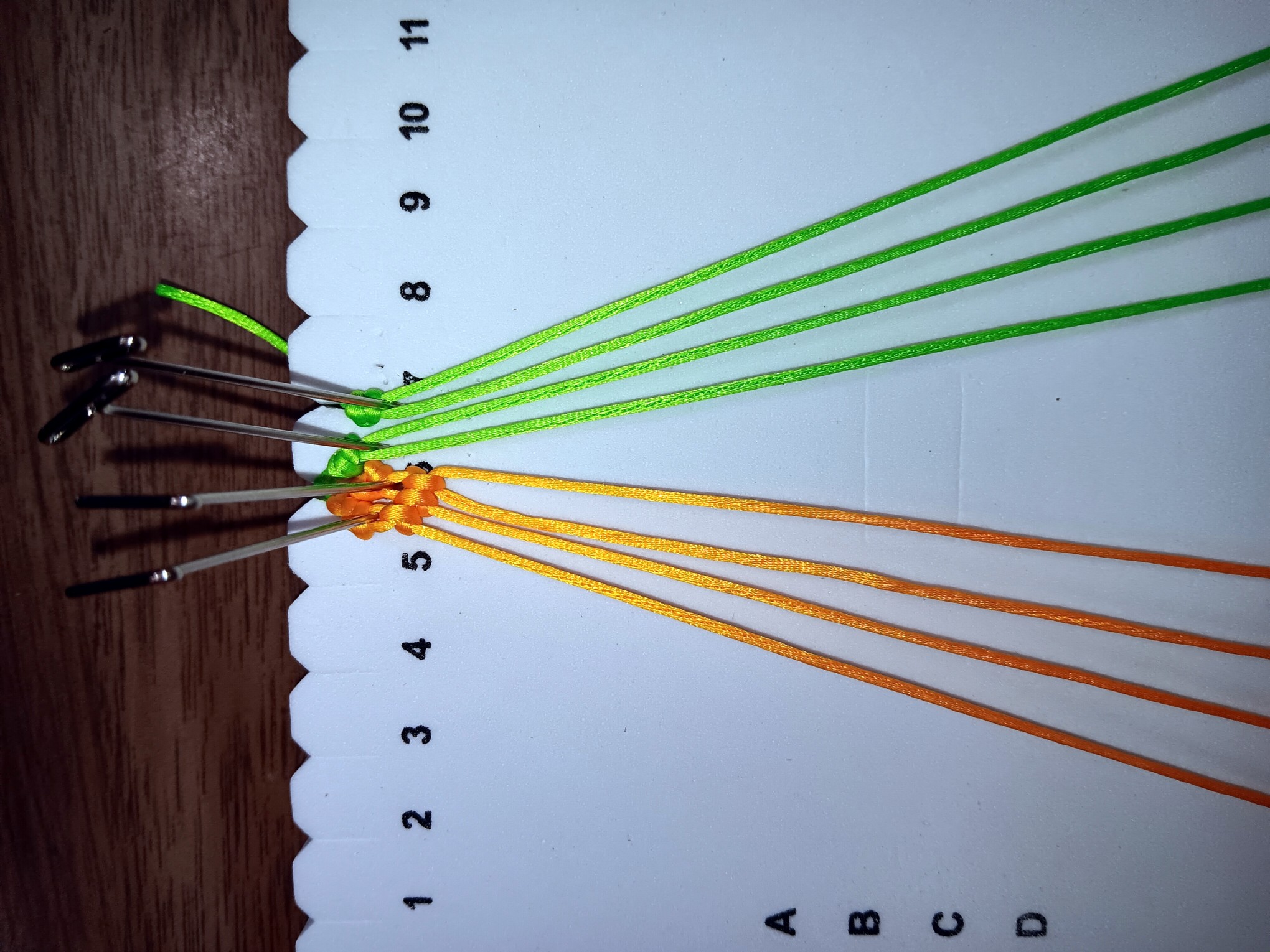 2° Nouez le fils extérieur Vert droit sur les 4 prochains fils (Toujours Nouer le fil vert avec 4 fils)