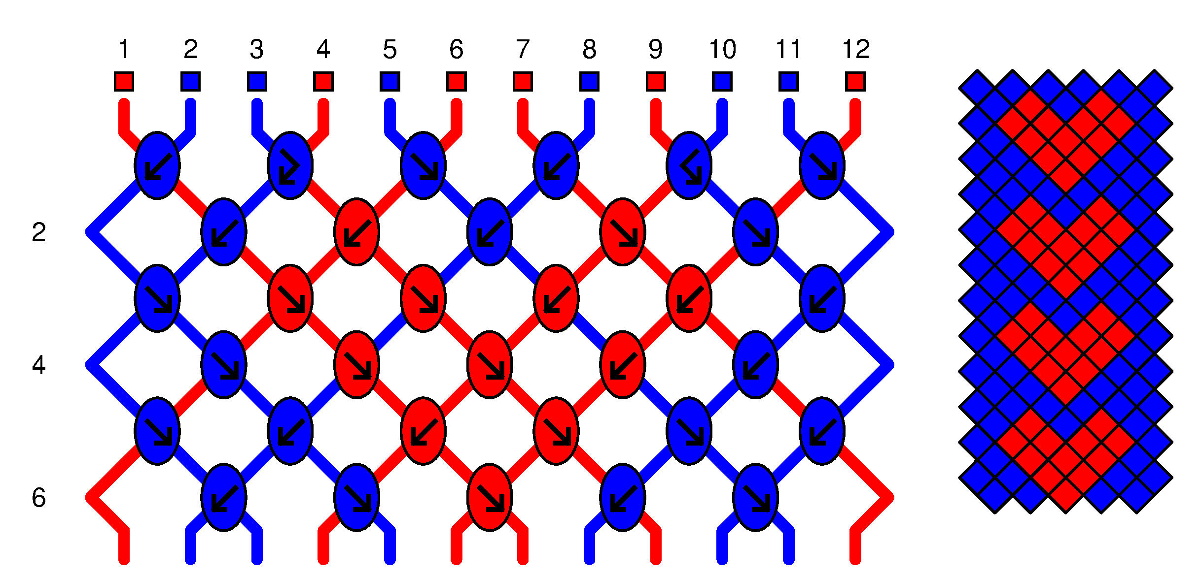 Coupez 12 fils (6 de chaque couleurs) de longueurs égales selon le Tableau.