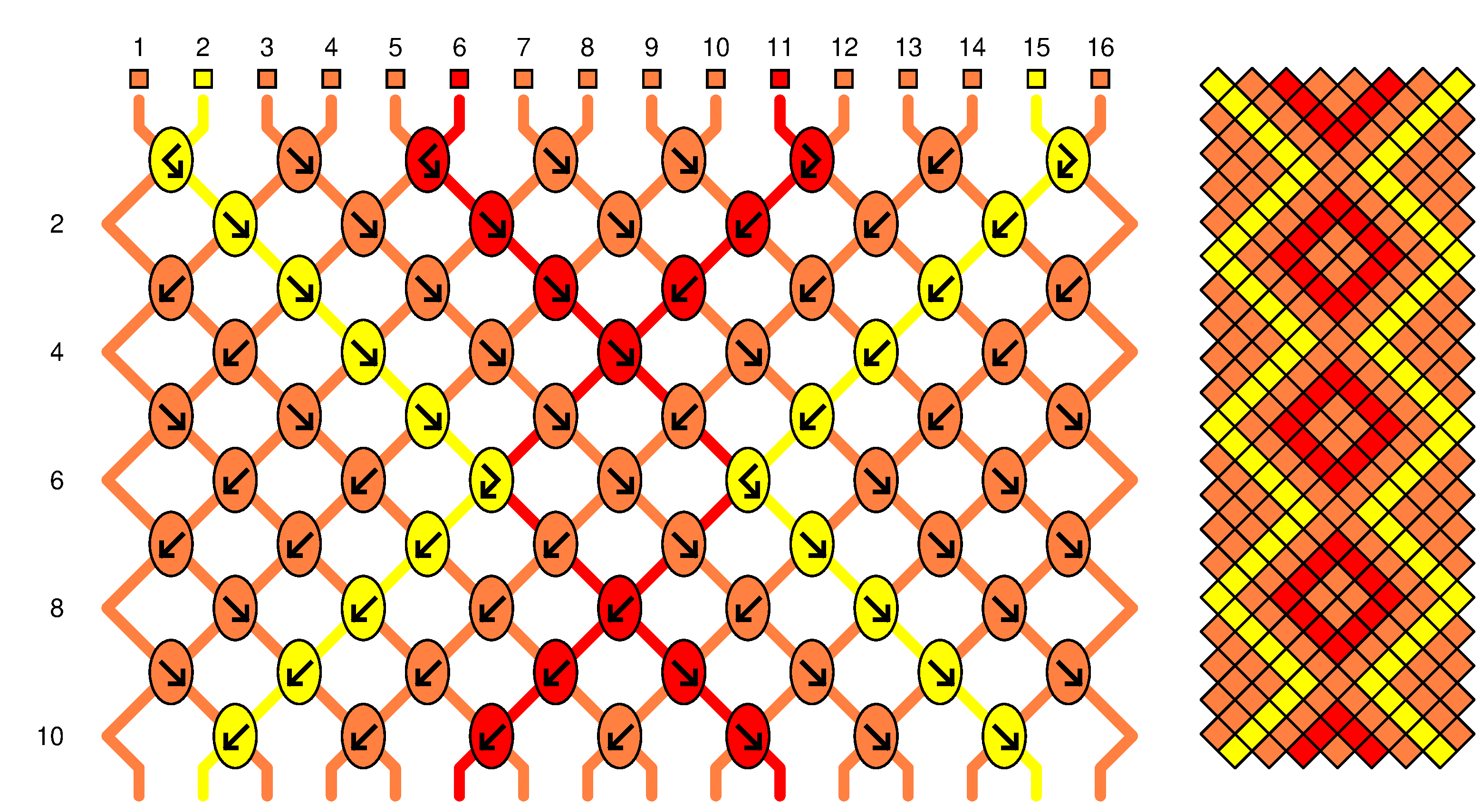 Coupez 16 fils (12 orange, 2 rouge, 2 jaune) de longueurs égales selon le Tableau.