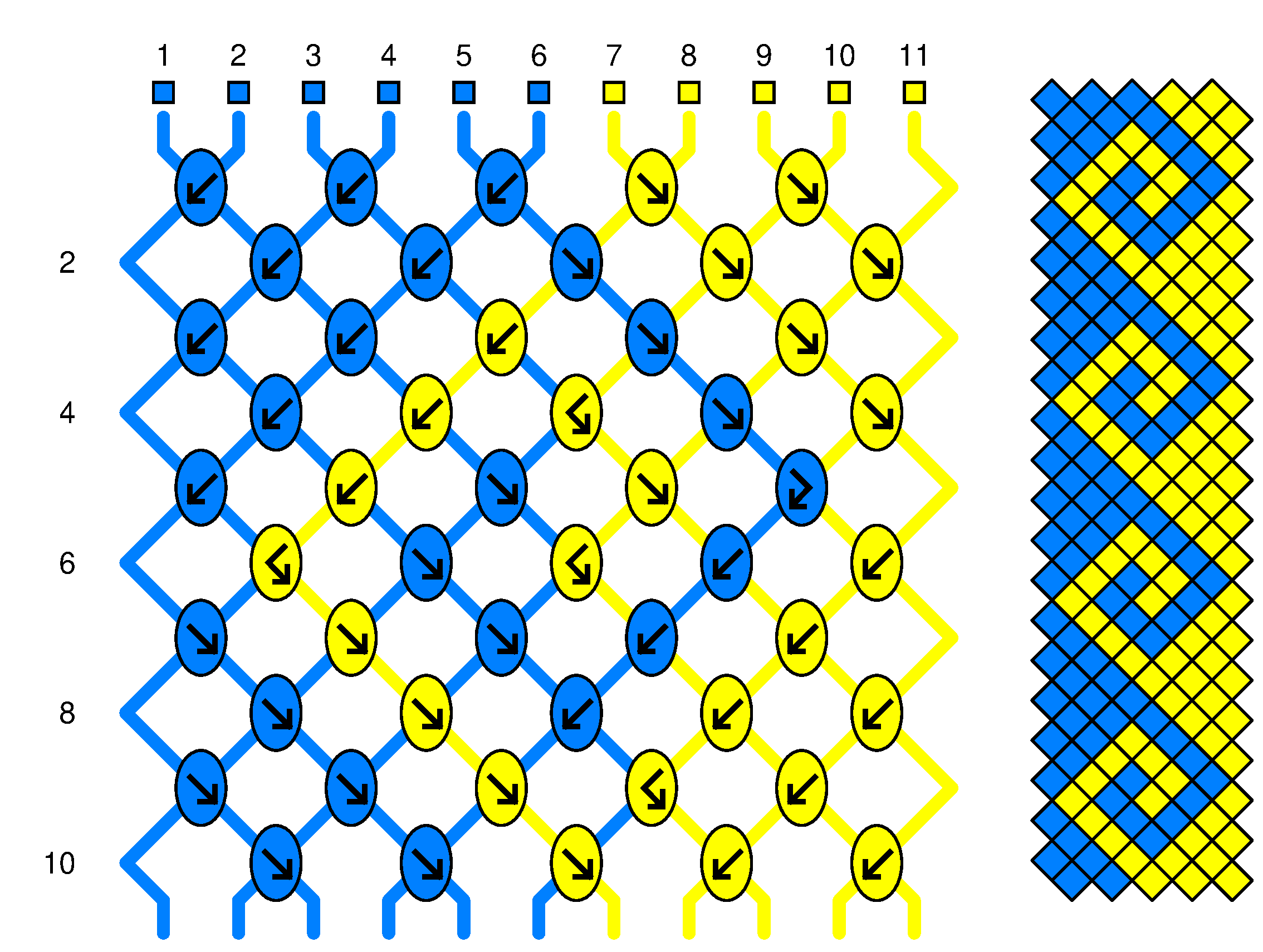 Coupez 11 fils (6 bleu, 5 jaune) de longueurs égales selon le Tableau.