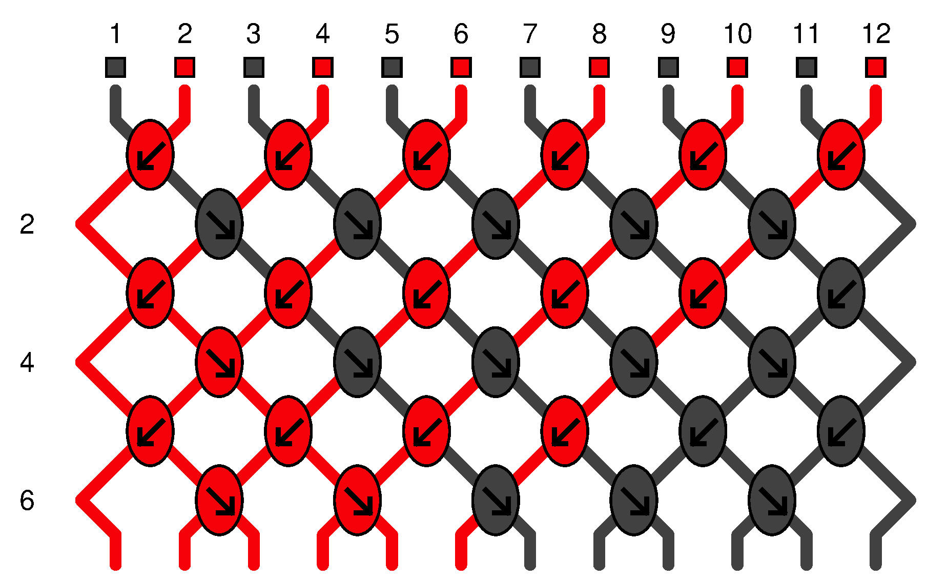 Répétez la procédure en reprenant depuis la rangée 1 ; à chaque nouvelle rangée, travaillez les fils en les tressant tels qu’ils se présentent.