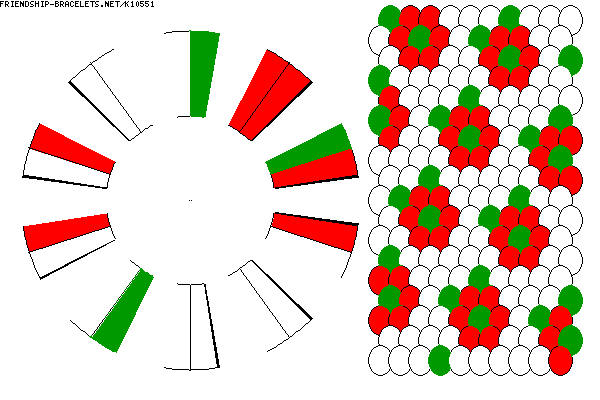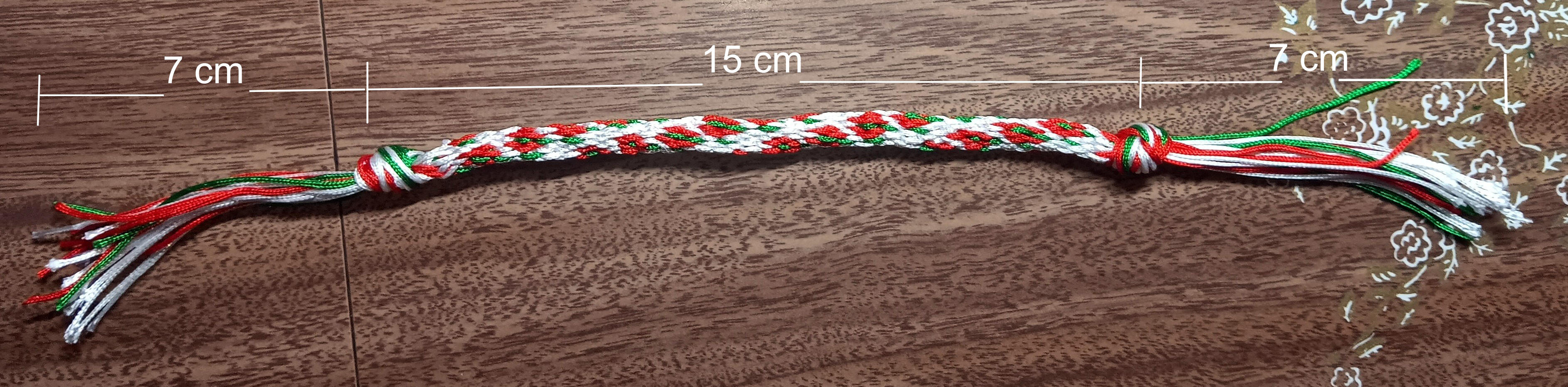 Kumihimo 20 fils 3 couleurs : 6 rouges, 3 verts, 11 blancs