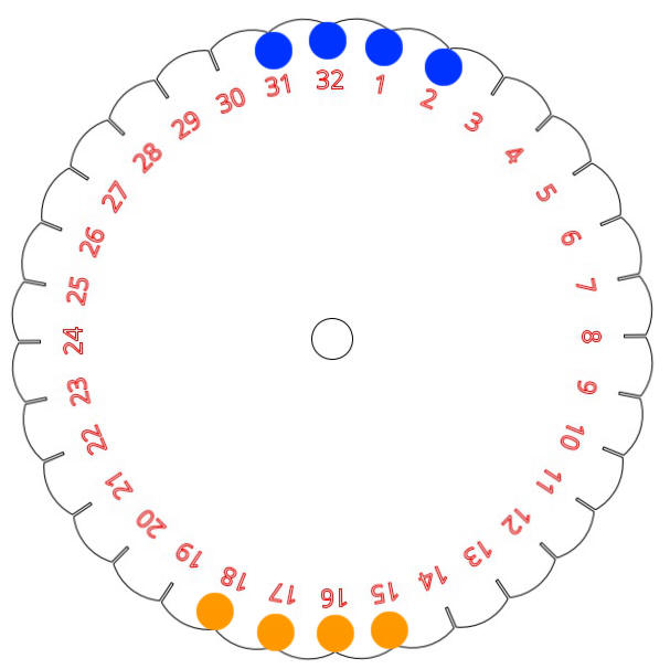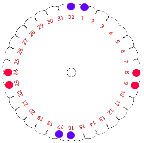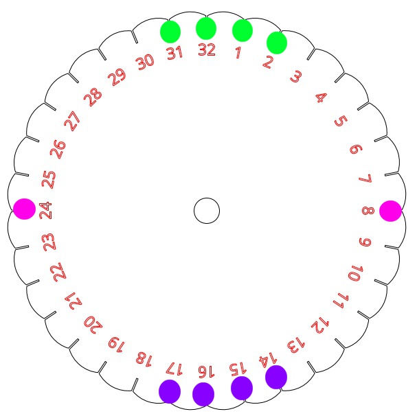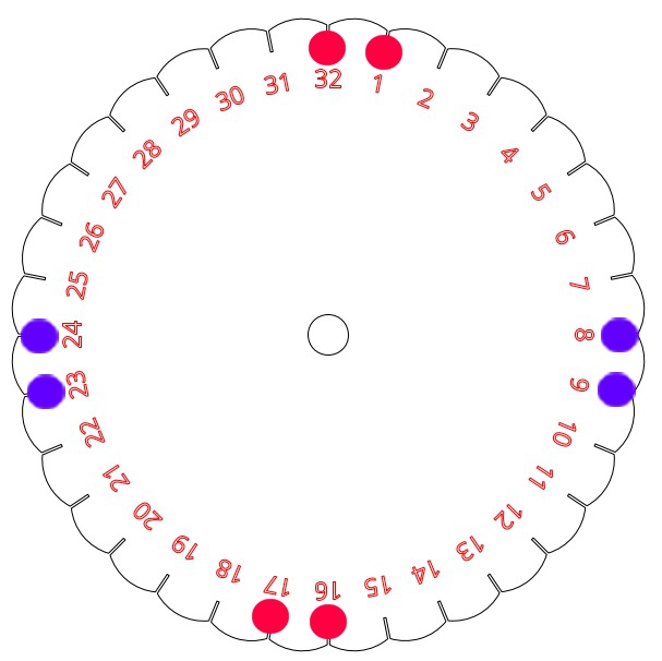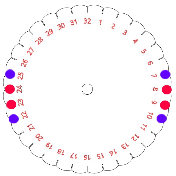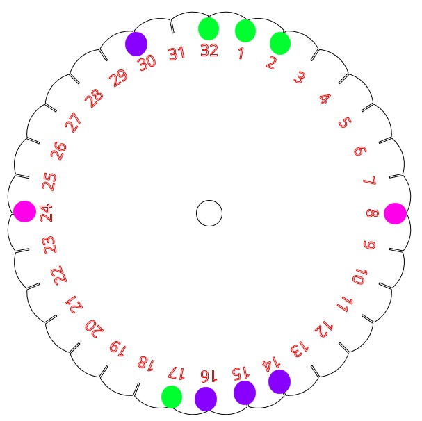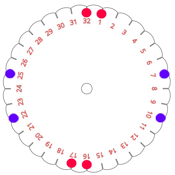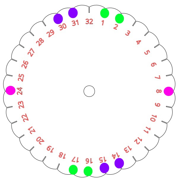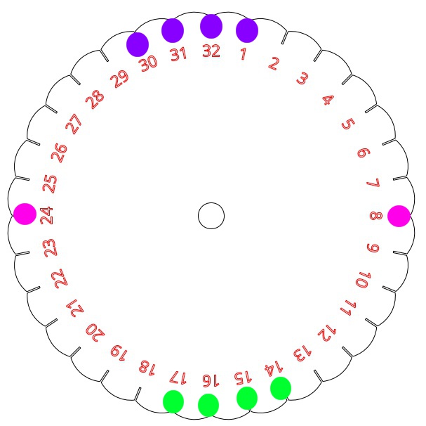 Cut 8 strands, 4 of each color. The strands should measure 5 times the desired braiding length. Make sure to start braiding by placing the disk so that #32 is facing up. The placement of the 8 strands on the disk is as shown below. i.e. in position 32-1, 8-9, 16-17, 24-25 |