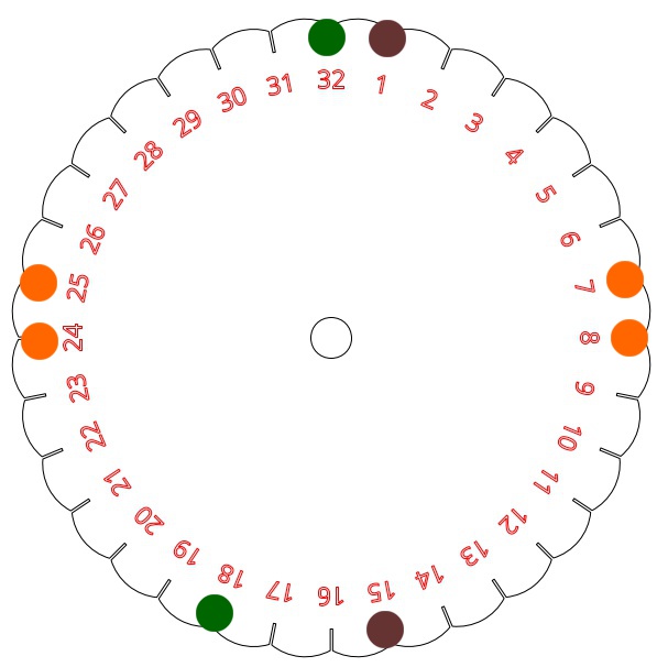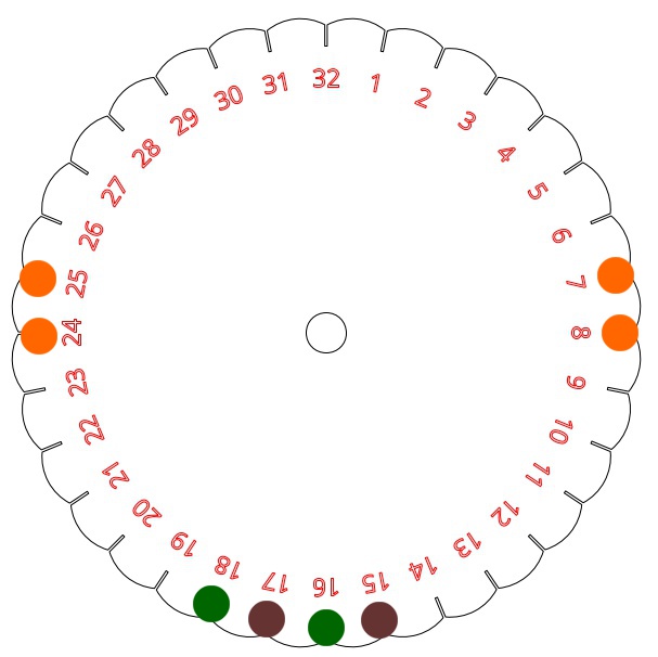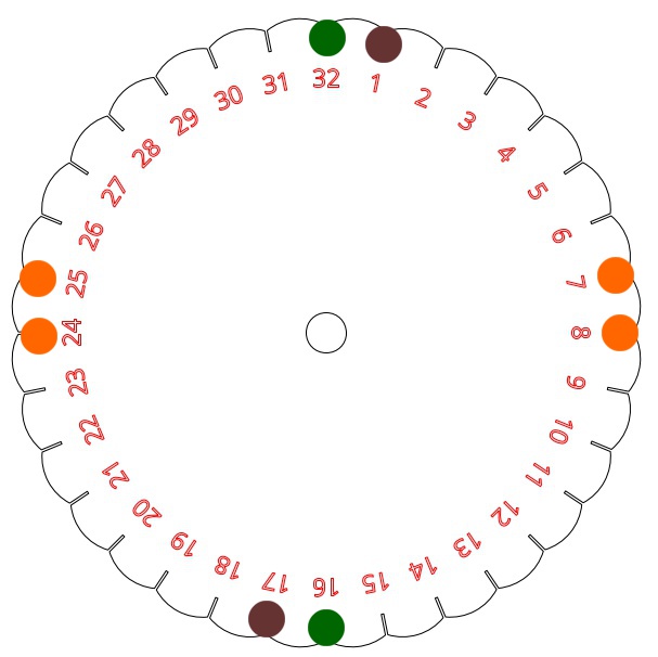 Cut 8 strands, 4 orange, 2 green, 2 brown. The strands should measure 5 times the desired braiding length. Make sure to start braiding by placing the disk so that #32 is facing up. The placement of the 8 strands on the disk is as shown below: |