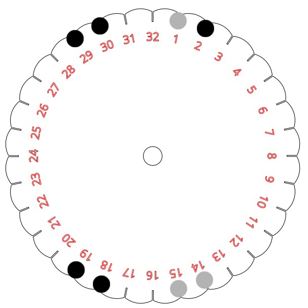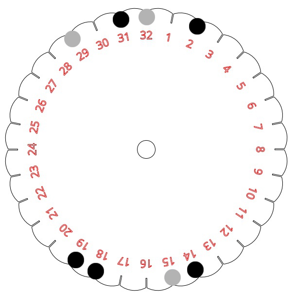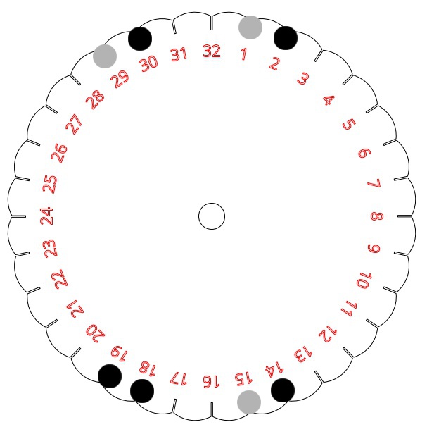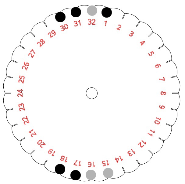 Cut 8 strands, 3 white, 5 black. The strands should be 5 times the desired braiding length. Be sure to start braiding by placing the disk so that #32 is facing up. The placement of the 8 strands on the disk is as shown below: |