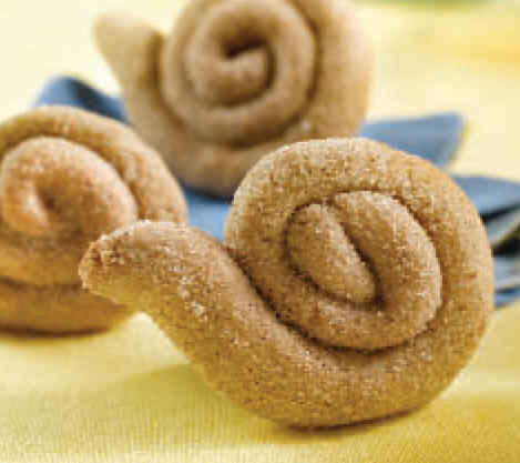 Rouler la pâte dans le sucre à la cannelle, faire ensuite une spirale pour lui donner la forme d'un escargot en laissant une section droite d'environ 1 1/2 po (4 cm) pour le cou et la tête.