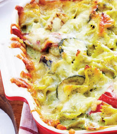 Mettre le reste du mélange de pâtes sur la sauce et couvrir du reste de sauce blanche avec pesto et du reste de fromage.