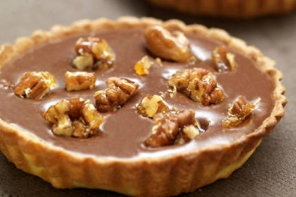Couronner la tarte refroidie avec un glaçage au chocolat satiné et avec des moitiés de noix de pécan.