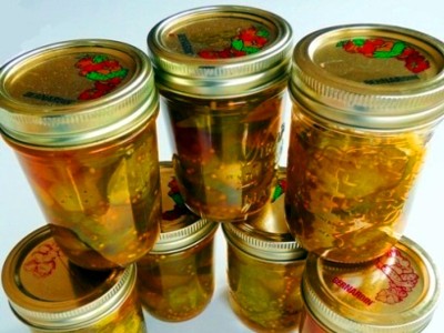 Dans un chaudron, portez à ébullition le vinaigre, les graines de céleri et de moutarde, le quatre-épices, le curcuma et le sucre.