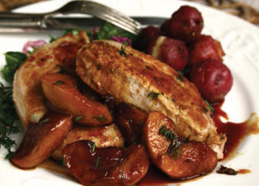 Déposer les côtelettes dans les assiettes et les accompagner des pommes en sauce.