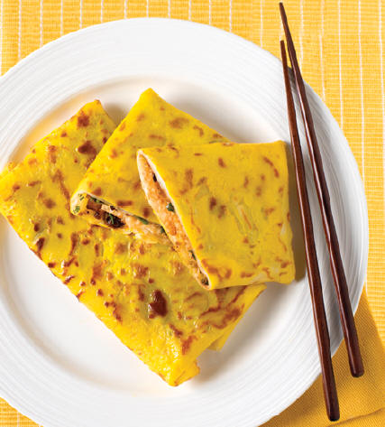 Glisser la crêpe sur une surface plate et déposer deux raviolis chinois croustillants au centre.
