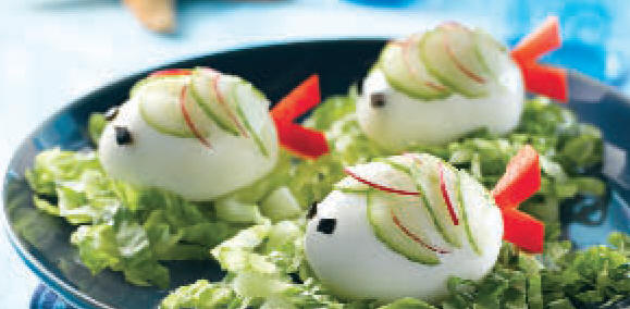 Pour créer le poisson, couper une petite tranche sur le sens de la longueur de chaque oeuf afin qu'il tienne en place.