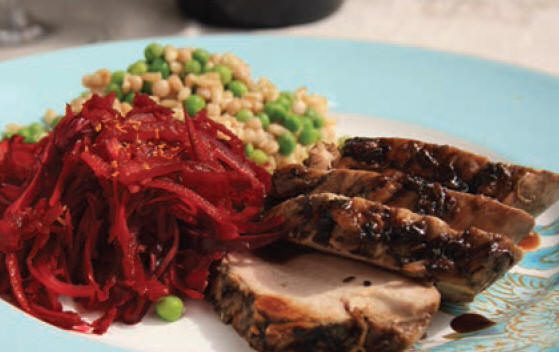 Faire de petites entailles, espacées d’environ 1 po, sur le dessus du filet de porc et y glisser les tranches d’ail.