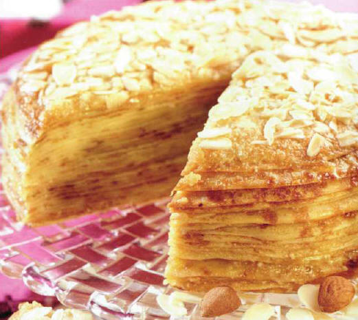 Enduire la dernière crêpe de crème d'amande et la saupoudrer d'amandes effilées.