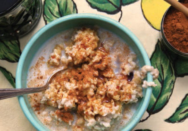 Verser un peu de lait, ajouter un filet de mélasse et une pincée de cannelle sur le gruau.