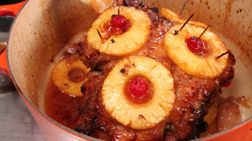 Badigeonnez de marmelade, garnissez de tranches d'ananas et de cerises, piquez quelques clous de girofle.