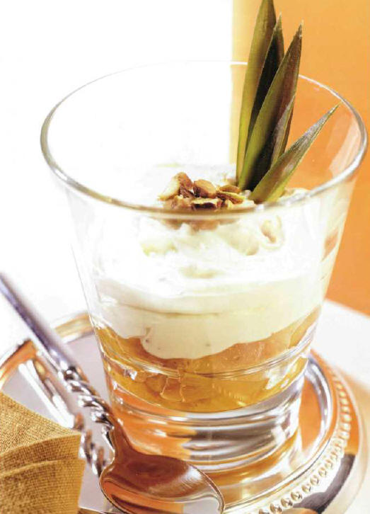 Disposer l'ananas avec son jus dans des verrines, recouvrir avec le fromage et servir.