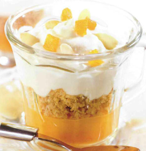 Avant de servir, décorer les desserts avec des amandes effilées grillées et les dés d'abricot.