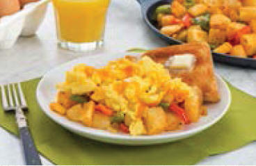 Oeufs brouillés au fromage accompagnés de pommes de terre rissolées
