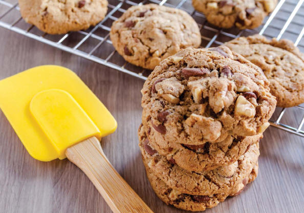 Incorporer 1 tasse (250 ml) de pépites de chocolat noir, au lait ou mi-sucré et, si désiré, 2/3 tasse (150 ml) de noix de Grenoble hachées à la pâte.