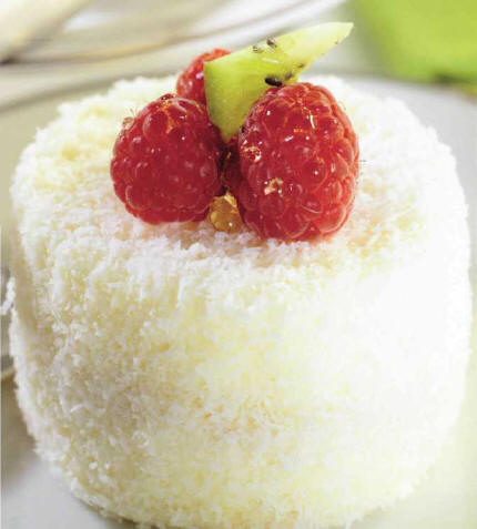 Enrober les gâteaux de noix de coco et les garnir de framboises et de morceaux de kiwi.