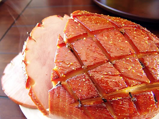 Verser sur le jambon et cuire environ 40 minutes au four modérément chaud (350° F), arroser occasionnellement.