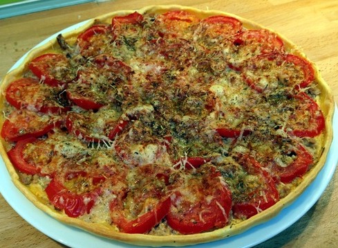 Poser ensuite une petite cuillerée de crème fraîche épaisse sur chaque rondelle de tomate et ajouter un peu de gruyère pour faire dorer la tarte.