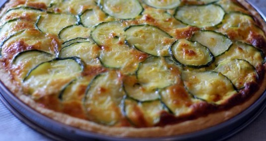 Disposez ensuite les poivrons aux échalotes et les courgettes sur le fond de tarte.