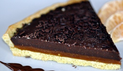 Tarte aux deux chocolats et caramel, crumble à la noisette
