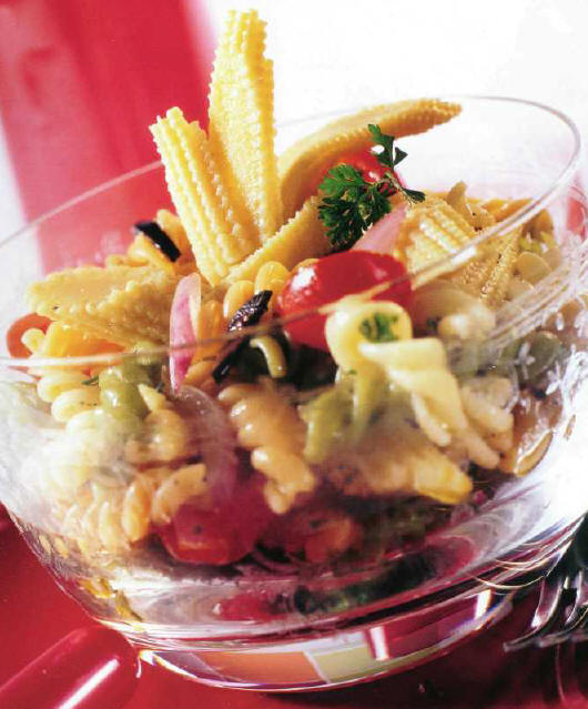 3 - Sur le plat de service ou dans un saladier, mélanger les pâtes avec les olives, les tomates, les mini épis de maïs, les cubes de fromage, le cacher et les oignons.