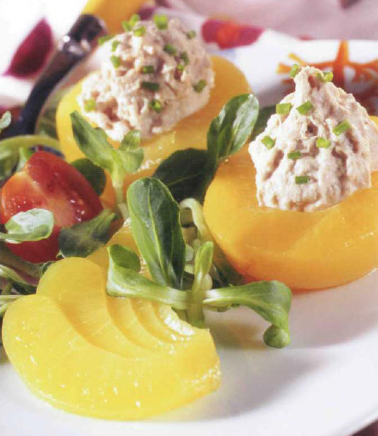4 - Sur le plat de service, disposer les feuilles de laitue, les arroser avec la sauce, déposer par-dessus les demi-pêches farcies au thon.