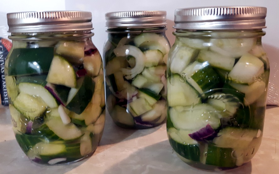 1 tasse de vinaigre et une c. à thé de sucre pour 3 tasses d’eau (donne assez de liquide pour 4 bocaux Mason de 500 ml.).