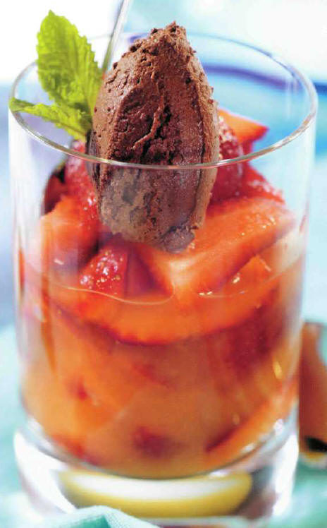 Servir la soupe de fruits dans des verres froids et les garnir de quenelles de chantilly de chocolat.