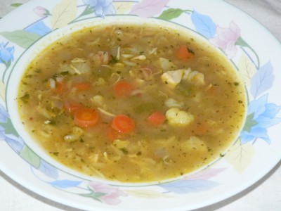 Ajoutez le bouillon de poulet, les morceaux de poulet et les herbes salées, et faites cuire 30 minutes à feu moyen.