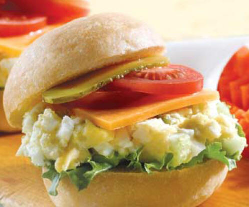 Placer un petit morceau de laitue sur la partie inférieure de chaque pain et garnir ensuite de salade aux oeufs, en la divisant en huit parts égales.