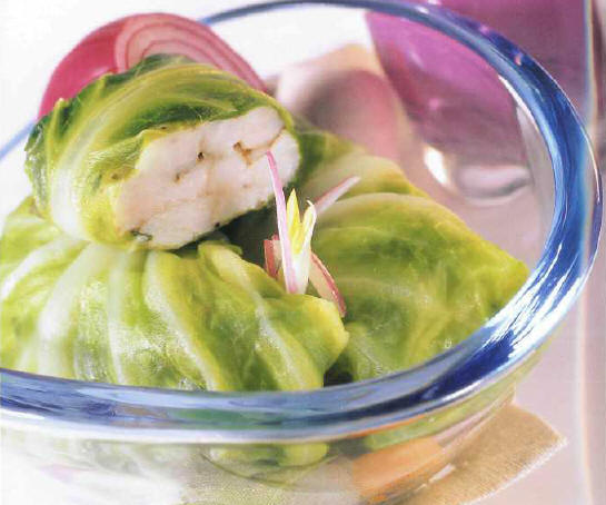 6 - Servir les farcis de chou au poisson chauds arrosés d'huile d'olive et accompagnés de la sauce mayonnaise rosé.