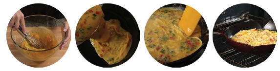 Placer la poêle sous le gril préchauffé durant 2 ou 3 minutes afin de faire fondre le fromage et gonfler la frittata ou mettre un couvercle et faire cuire durant quelques minutes sur la cuisinière.