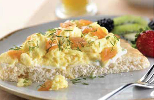 Étendre la préparation à la crème sure sur la focaccia chaude, déposer les oeufs brouillés à la cuillère sur le dessus.
