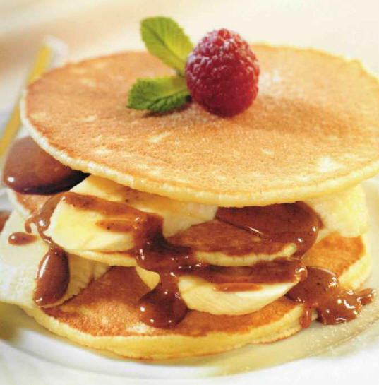 Sur le plat de service, disposer un pancake, puis une banane découpée en rondelles, napper d'amlou.