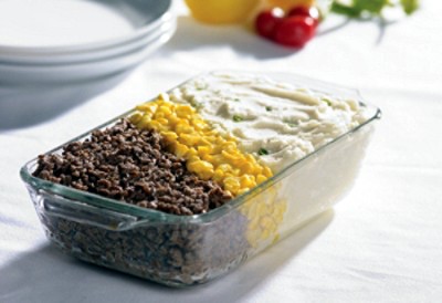 Déposez le boeuf haché dans un plat allant au four, en étageant ajoutez le