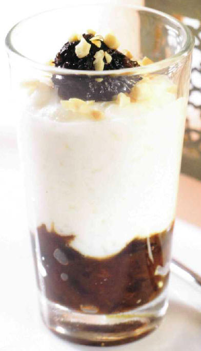 Dresser la compote de pruneaux dans des vérines et la recouvrir de riz au lait.