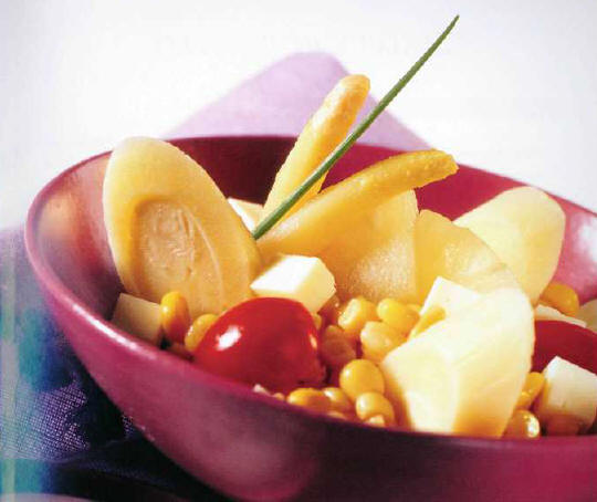 3 - Sur le plat de service ou dans un saladier, mélanger délicatement les asperges avec le fromage, le maïs, les coeurs de palmier, l'ananas et les tomates.