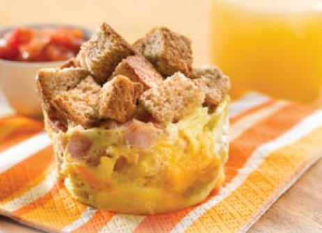 Dans un bol, fouetter les oeufs, le bacon et le fromage à la fourchette, verser la préparation dans la tasse.
