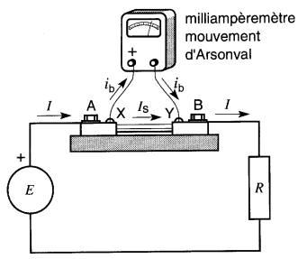 Le courant I qui traverse le circuit d'utilisation se divise en deux parties: la plus grande partie IS passe dans le shunt et une faible partie ib est dérivée dans le milliampèremètre.