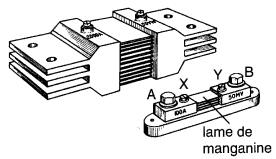 Même si la chute de tension correspondante n'est que de 50 mV, la puissance dégagée pour une telle intensité est de 500 W, ce qui requiert une bonne ventilation, assurée par la structure lamellée des plaques de manganine (Fig. 6-3b).