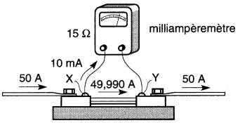 10 mA (ou 0,010 A) dans la bobine et (50 -0,010) = 49,990 A dans le shunt.