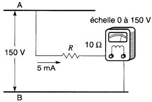 On désire que l'aiguille donne une déviation complète pour une tension de 150 V appliquée entre les points A et B (Fig. 6-6).